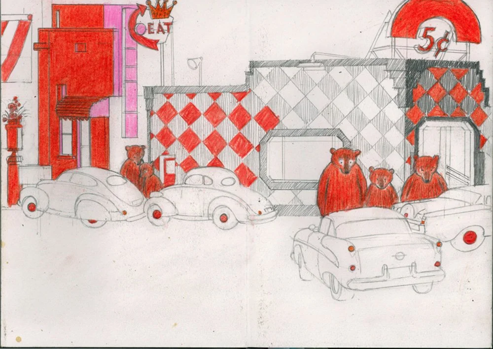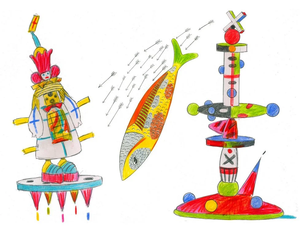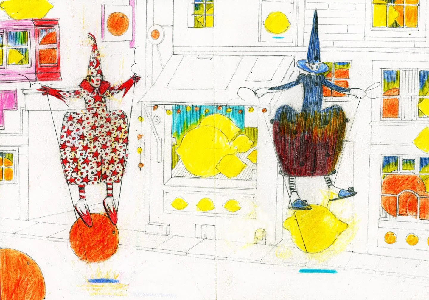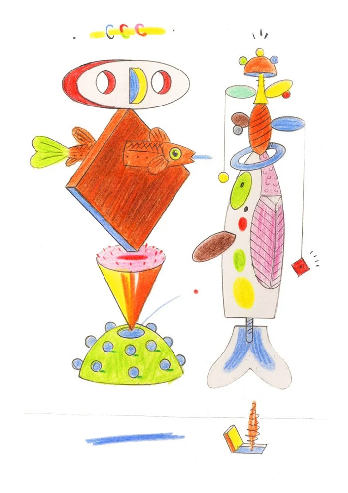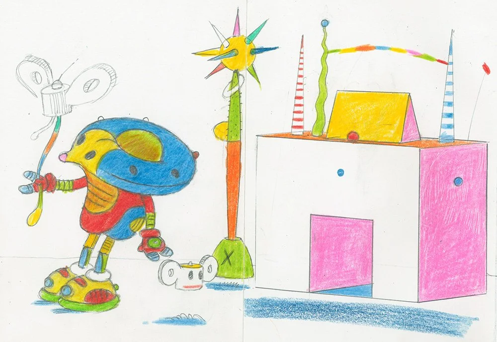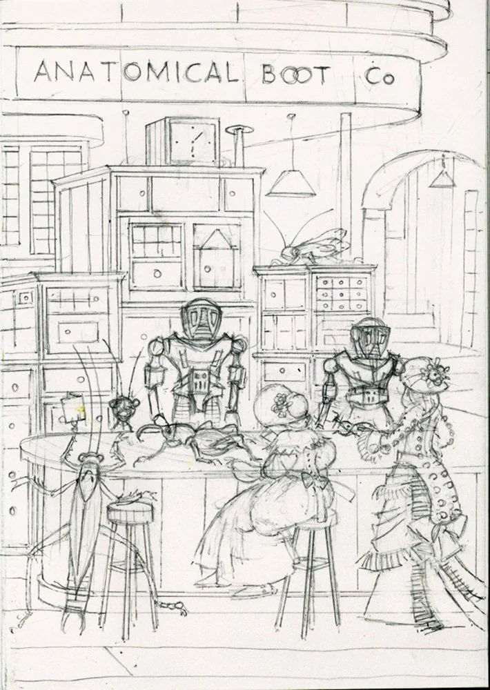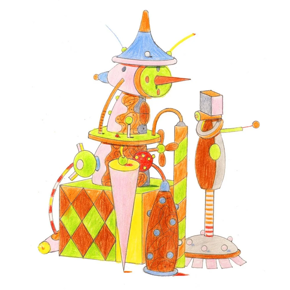 My love of architecture, costume and surreal humour proliferates. Many of the objets d’art, robots and other items from the curious and particular collections in the house and studio serve as inspiration, although rarely for direct observational drawings. My interest is in creating ideas.